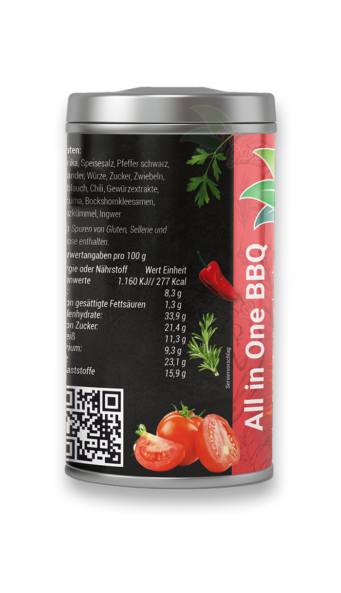 Unser vielseitiges All in One BBQ Gewürzmischung ist ideal für unvergesslichen Grillgenuss, saftiges Hackfleisch und alle Arten von Fleisch. Die sorgfältig ausgewählte Kombination aus intensivem Paprika, würzigem Knoblauch und einer subtilen Rauchnote verleiht Ihren Gerichten eine unwiderstehliche Geschmacksdimension. Ob auf dem Grill, in der Pfanne oder im Ofen - All in one BBQ bringt köstlichen Geschmack auf den Teller. Entdecken Sie das Geheimnis unvergleichlichen Grillvergnügens mit All in One BBQ Gewürzmischung!